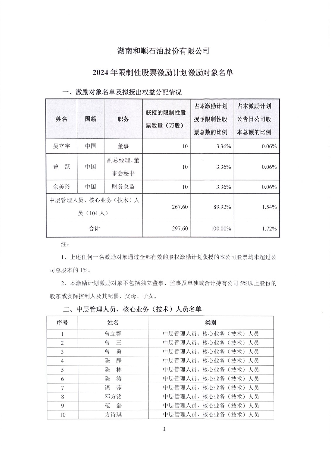 湖南和順石油股份有限公司2024年限制性股票激勵計劃激勵對象名單